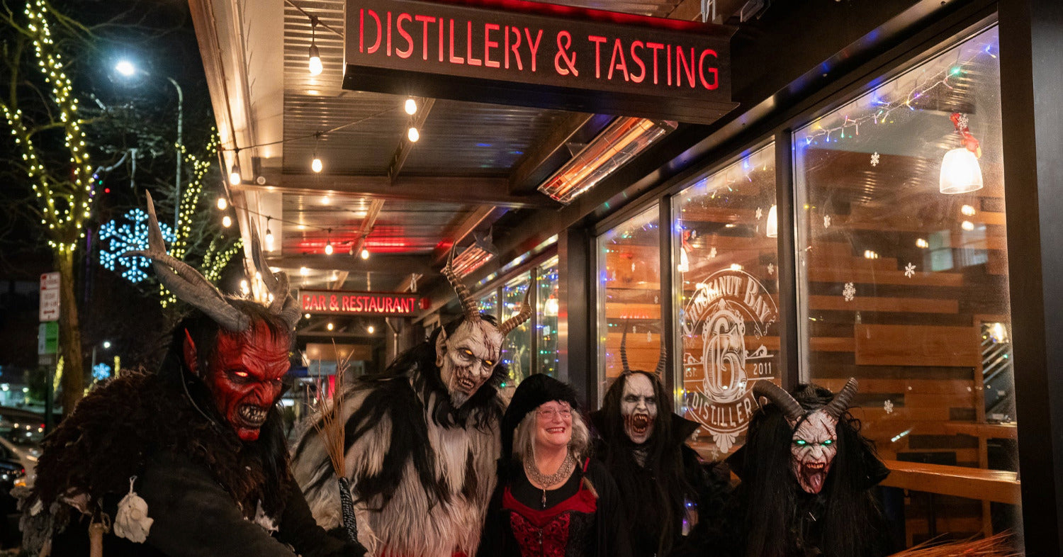 Today, Krampus has a devoted following across Washington and beyond — showing up at holiday parties, winter gatherings, and cocktail bars throughout the region. Seattle now hosts the annual Krampus Krawl, featuring 50+ bars each creating their own Krampus cocktails. And every November, our own Krampus Night at Chuckanut Bay Distillery sells out — a spirited celebration of 300+ guests featuring Krampus Seattle, live music, and the best winter cocktails of the season.